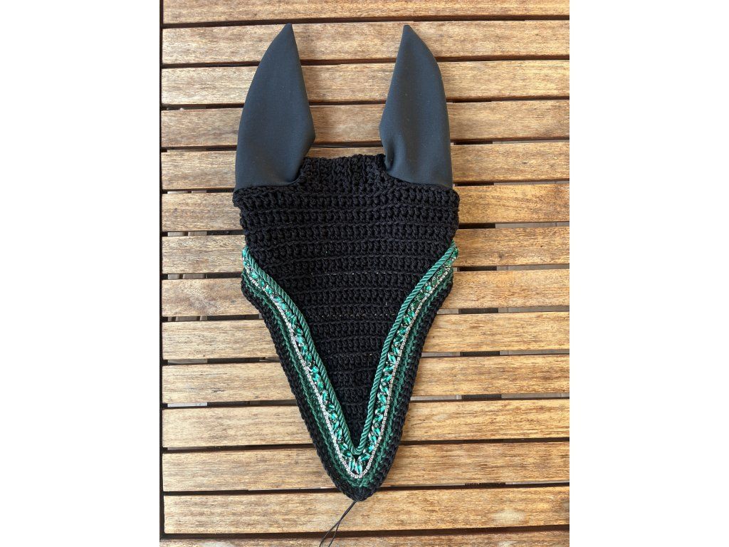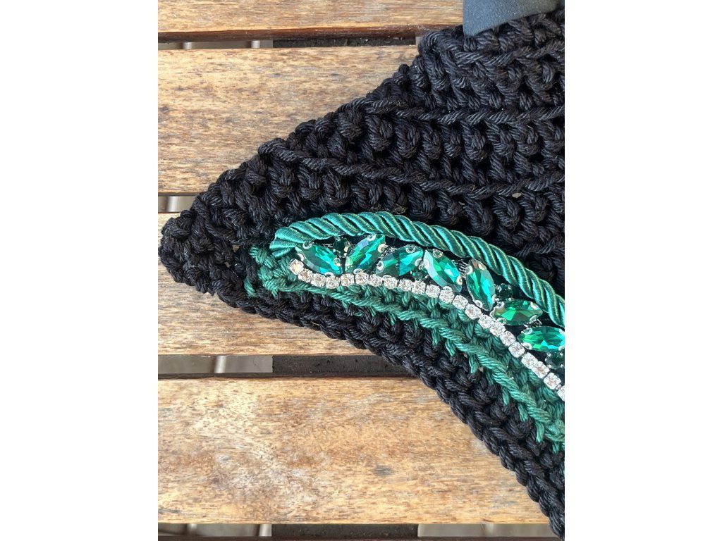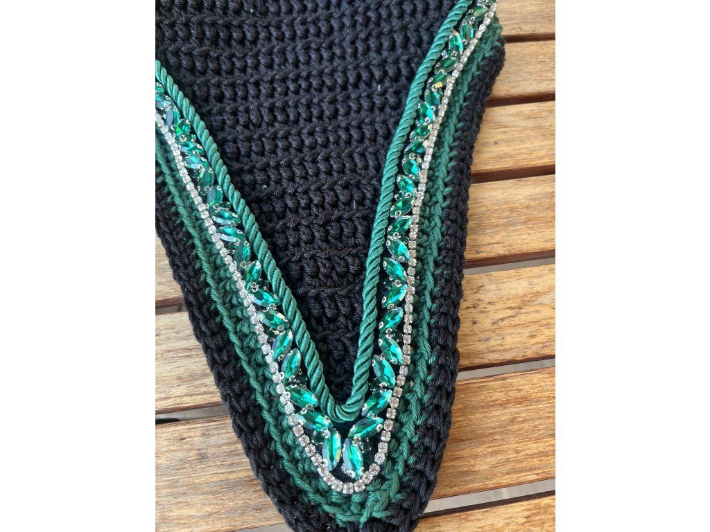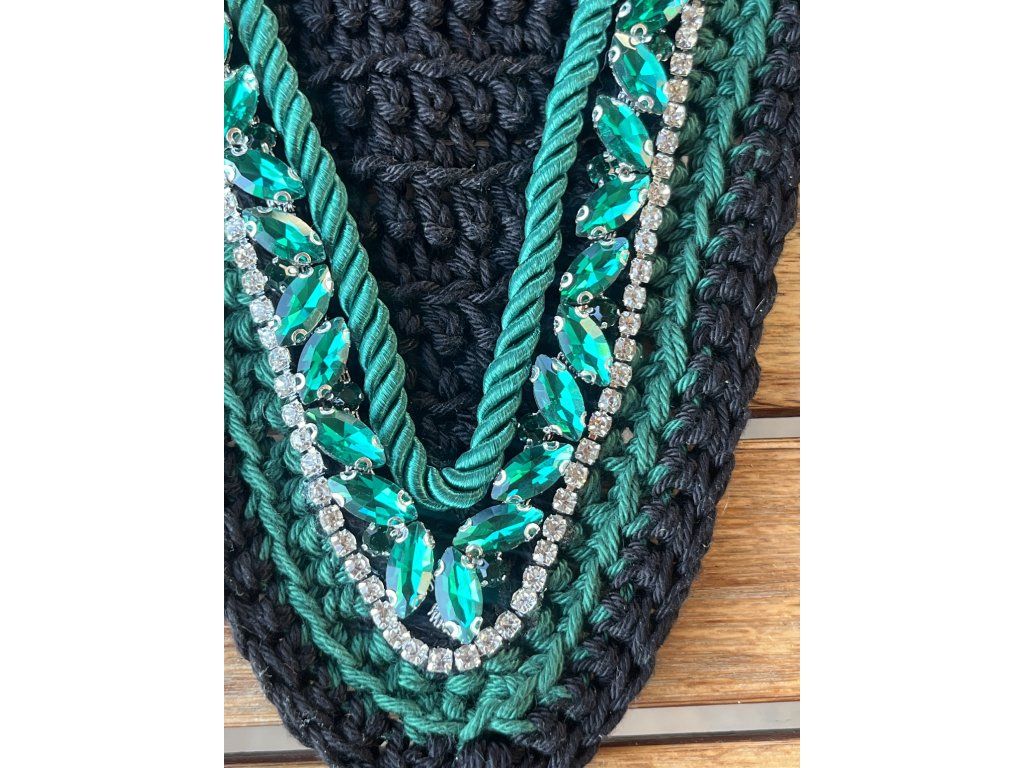 Každý prvek je pečlivě ručně zpracovaný — od zeleného řetízku v motivu lístků až po decentní stříbrné detaily, které společně vytvářejí dojem jemného, živoucího lesního světla. Zelené akcenty dodávají celé čabrace dojem svěžesti, zatímco propracované zdobení působí luxusně a přitom nevtíravě.
