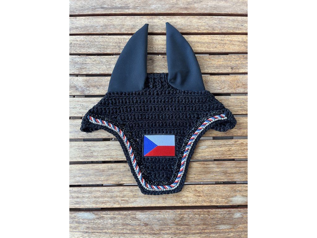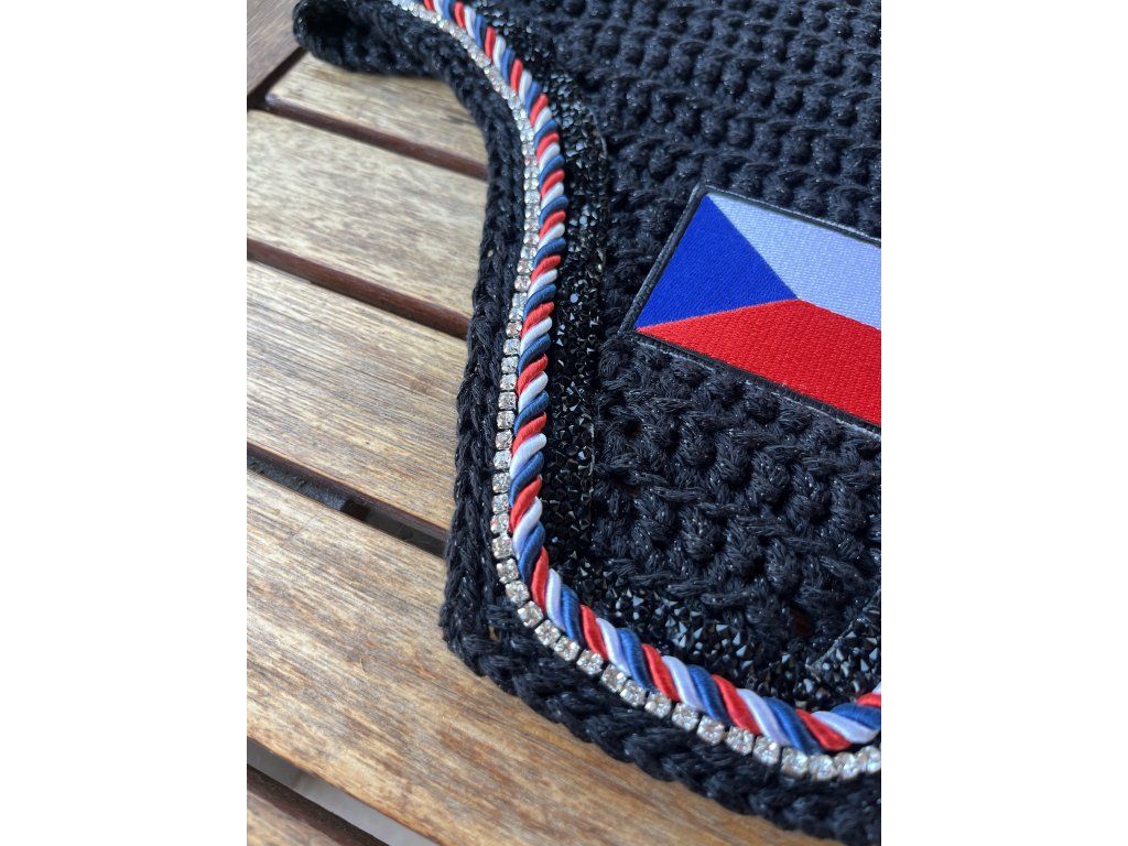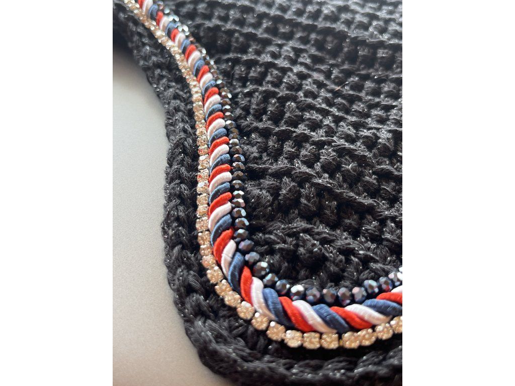 Speciální čabraka ze třpytivé příze a smotané šňůrky na přání ze tří barev, s černými lesklými korálky a třpytivým kamínkovým řetízkem.